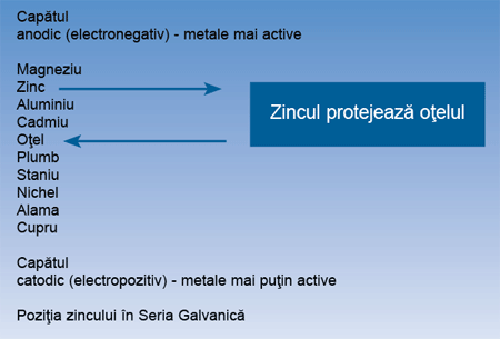 Datorită caracterului electronegativ al zincului (E = -0,76 V), faţă de al fierului (E = -0,44 V), în cuplul Zn-Fe; zincul devine anod, şi se corodează (se sacrifică), iar oţelul din substrat nu se corodează deoarece devine catod (este protejat catodic).